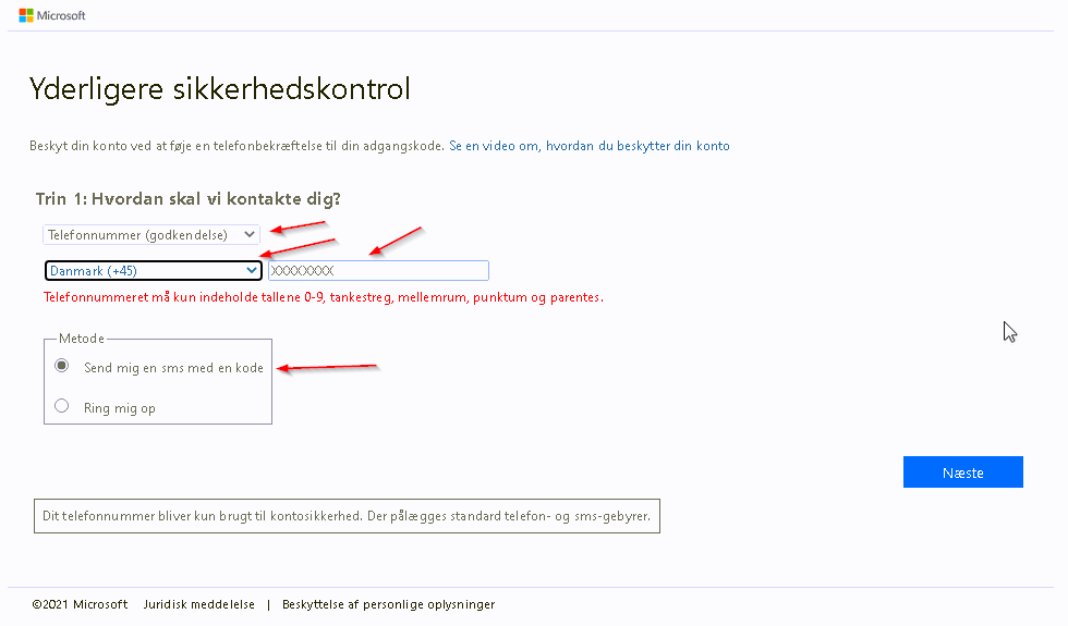 Tjek (angivet med røde pile her i eksemplet) at den står til telefonnummer godkendelse, og at XXXXXXXX passer med dit mobil telefonnummer samt at den under metode står til send mig en sms med en kode. Tryk derefter på næste